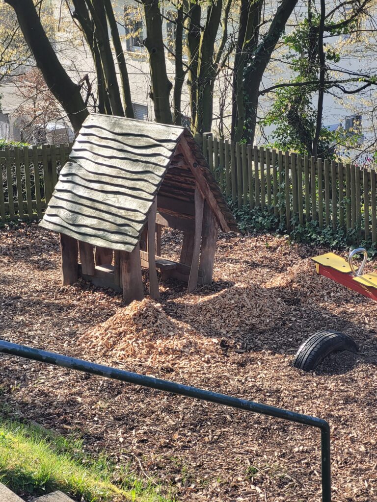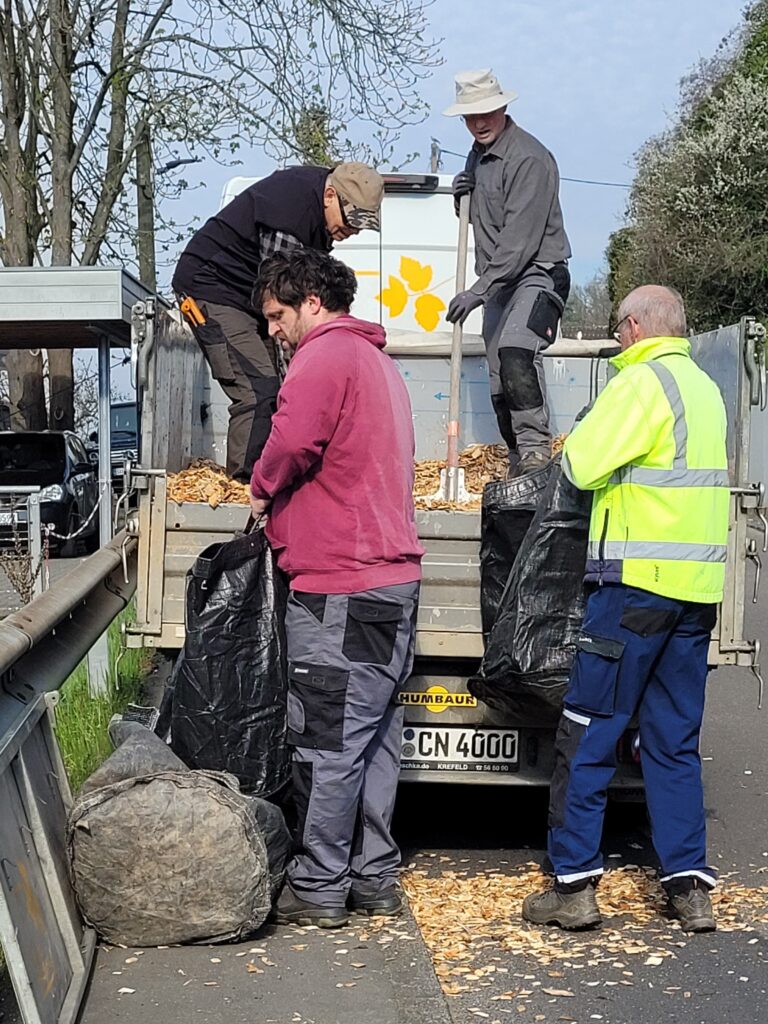 Markus hatte seinen Lupo mit allerlei Werkzeug beladen und zusätzlich auf dem Anhänger die Großgeräte dabei. Tobi hatte seinen Anhänger bis oben hin mit Hackschnitzeln gefüllt. Schnell hatte jeder seine Aufgabe gefunden und sich mit Werkzeug ausgestattet. Oben wurden Hackschnitzel in Big Packs geschaufelt, am Hang die Wiese gemäht und die Bäume sowie Sträucher zurückgeschnitten. Andere hatten die mühsame Aufgabe, die gefüllten Big Packs den Hang hinunterzutragen und am Spielpunkt auszuschütten, wo sie anschließend von den kleinsten Helfern verteilt wurden.