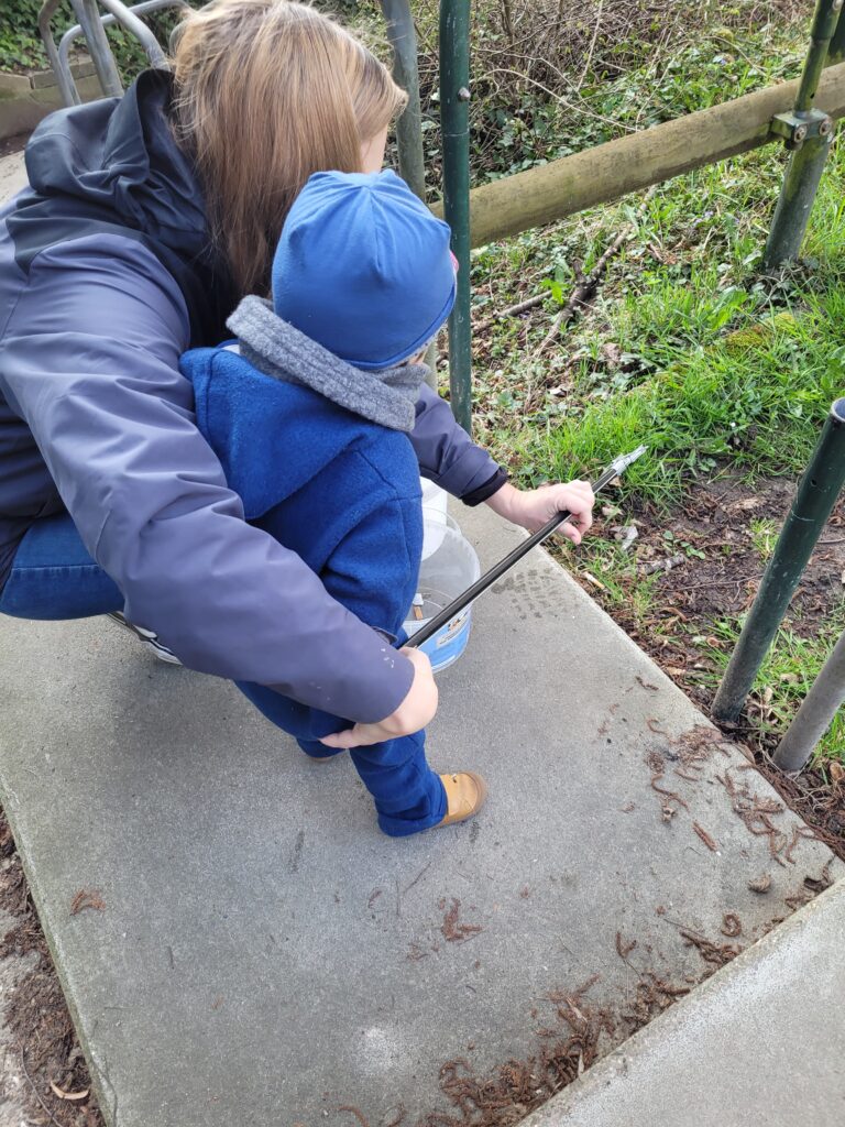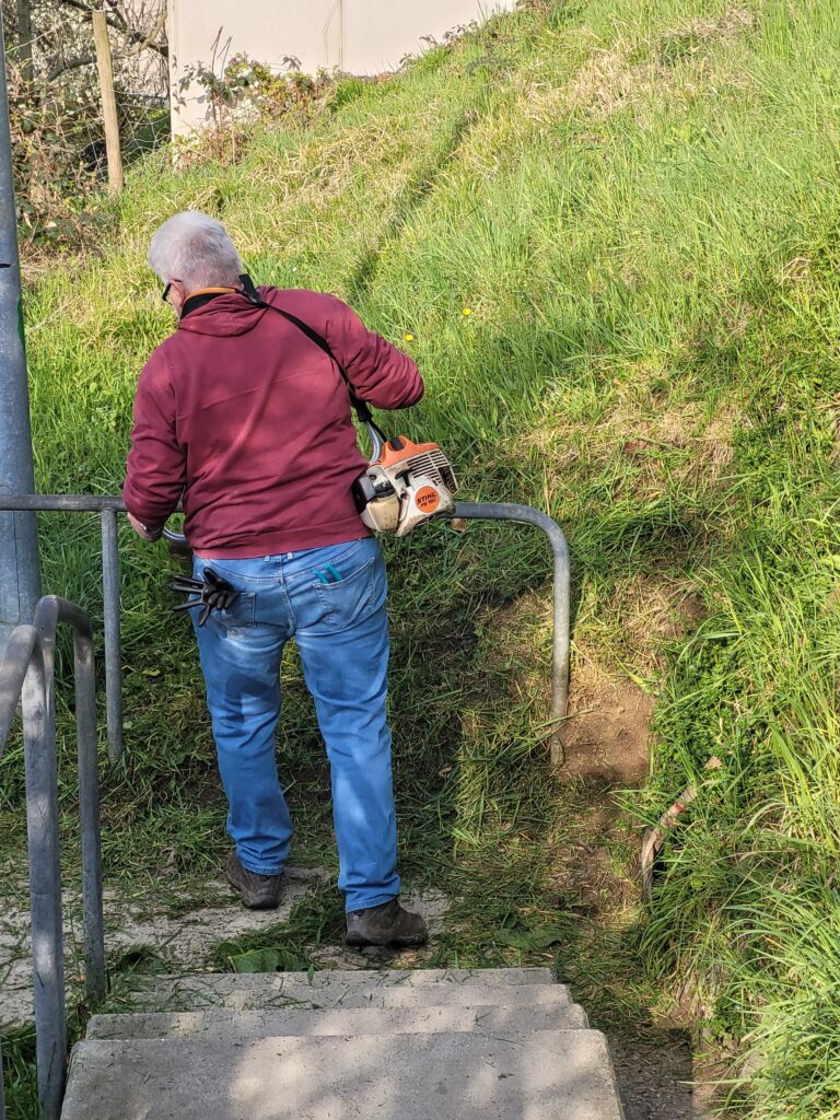 Unermüdlich ging es die Treppe rauf und runter. Auch die Treppe selbst wurde gründlich gereinigt. Die Erde, die den Winter über den Hang hinuntergerutscht war und die es sich auf den Stufen gemütlich gemacht hatte, wurde entfernt, die Grasnarbe begradigt und alles wieder sauber und ordentlich hergerichtet.